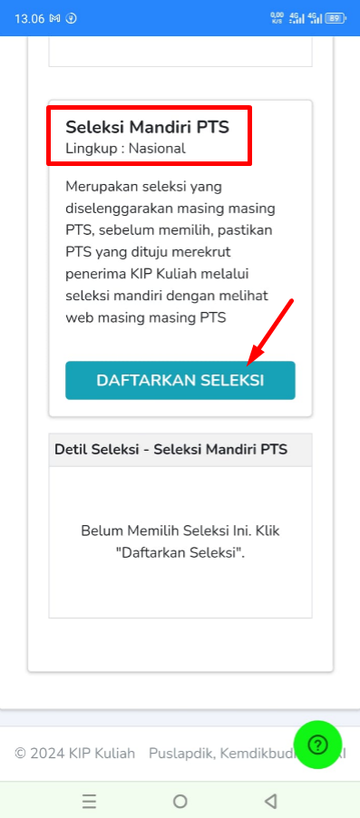 Silakan login ke akun KIP Anda, buka menuSeleksi > Seleksi Mandiri PTSlalu klik tombolDAFTARKAN SELEKSI
