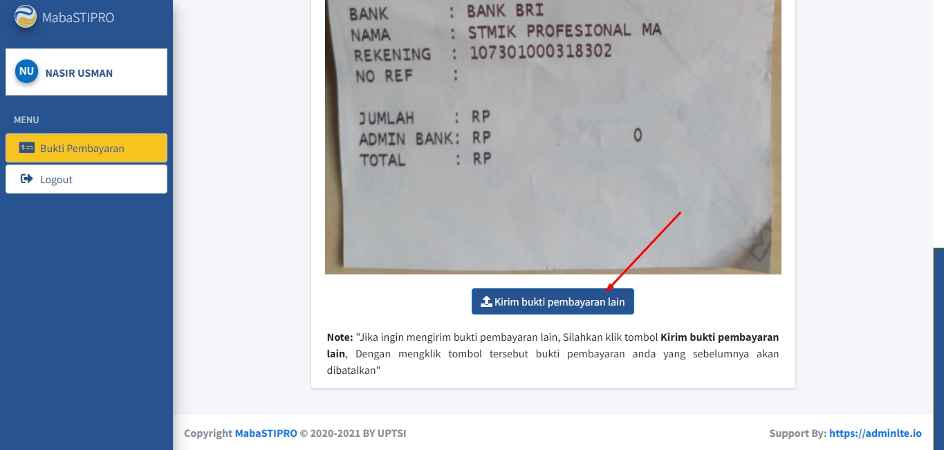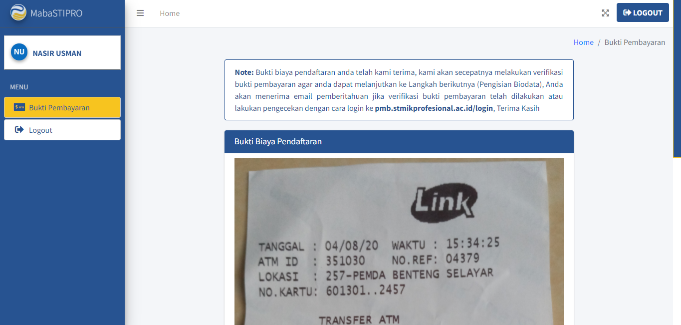 Jika Anda berhasil mengunggah bukti pembayaran, Anda akan dialihkan ke halaman yang menyatakan bahwa bukti pembayaran Anda telah diterima oleh Admin.