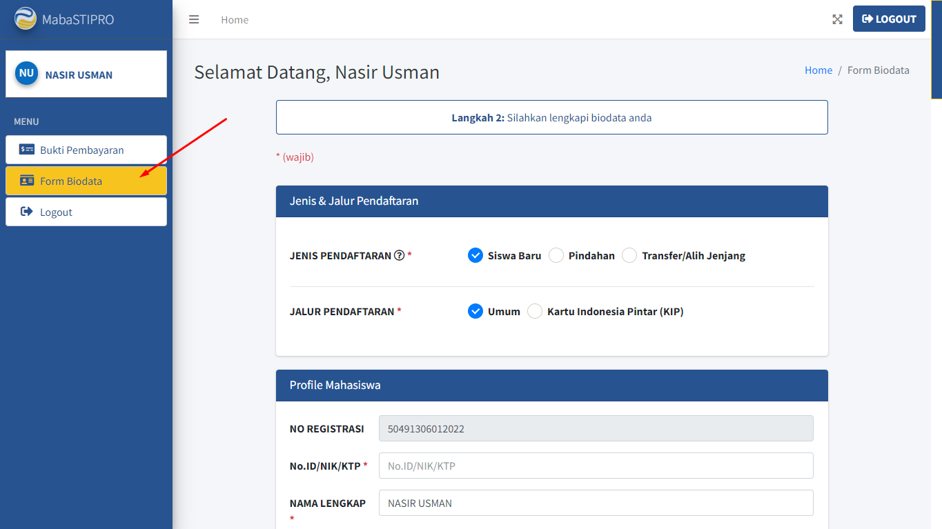 Pada tahap ini, Anda akan diminta untuk mengisi biodata. Untuk memulai, klik menu "Form Biodata". Berikut adalah tampilannya.