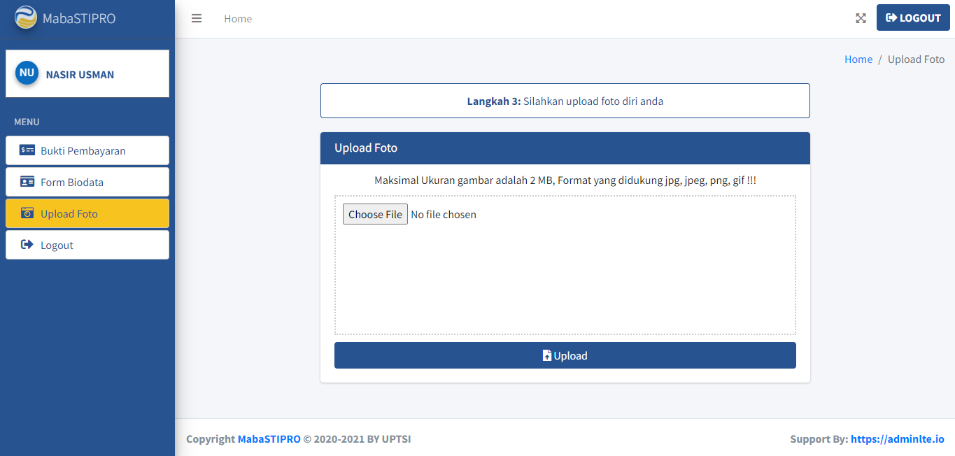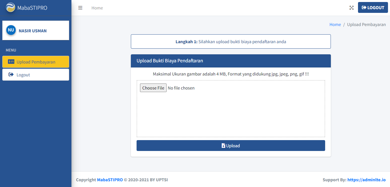 Pastikan gambar bukti biaya pendaftaran Anda jelas agar mudah dilihat oleh admin saat memverifikasi pembayaran. Maksimal ukuran gambar adalah 4 MB (Tips: Cara Kompres dan Memperkecil Ukuran Gambar). Format gambar yang didukung adalah jpg, jpeg, png, dan gif. Berikut adalah tampilan form untuk mengupload bukti biaya pendaftaran.