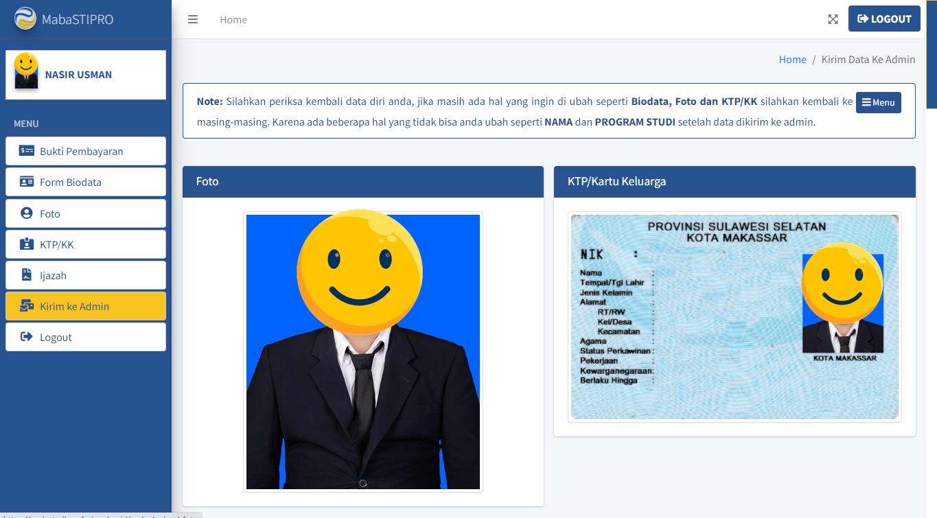 Pastikan data seperti Foto Diri, KTP, dan Biodata sudah sesuai sebelum mengirimkannya ke Admin. Jika ada hal yang ingin diubah, kembali ke menu masing-masing. Perhatikan bahwa beberapa hal seperti NAMA dan PROGRAM STUDI tidak dapat diubah setelah data dikirim ke Admin.