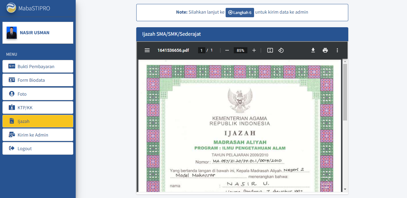 Tampilan setelah Ijazah di upload