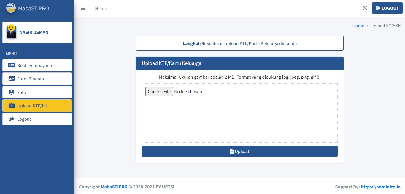 Pada Langkah 4, Anda diminta untuk mengunggah foto KTP atau Kartu Keluarga Anda. Batas ukuran gambar maksimum adalah 2 MB, dan format yang didukung adalah jpg, jpeg, png, dan gif. Pastikan bahwa gambar yang Anda unggah sesuai dengan format yang ditentukan agar dapat diterima oleh sistem.