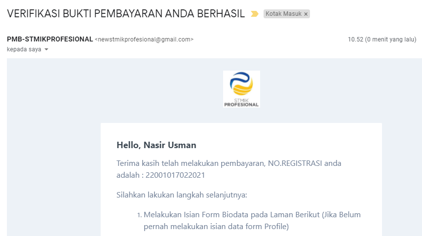 Setelah admin memverifikasi bukti pembayaran Anda, Anda akan menerima email yang menyatakan bahwa bukti pembayaran Anda telah berhasil diverifikasi. Selanjutnya, Anda dapat melanjutkan ke langkah berikutnya yaitu mengisi biodata. Berikut adalah tampilan emailnya.